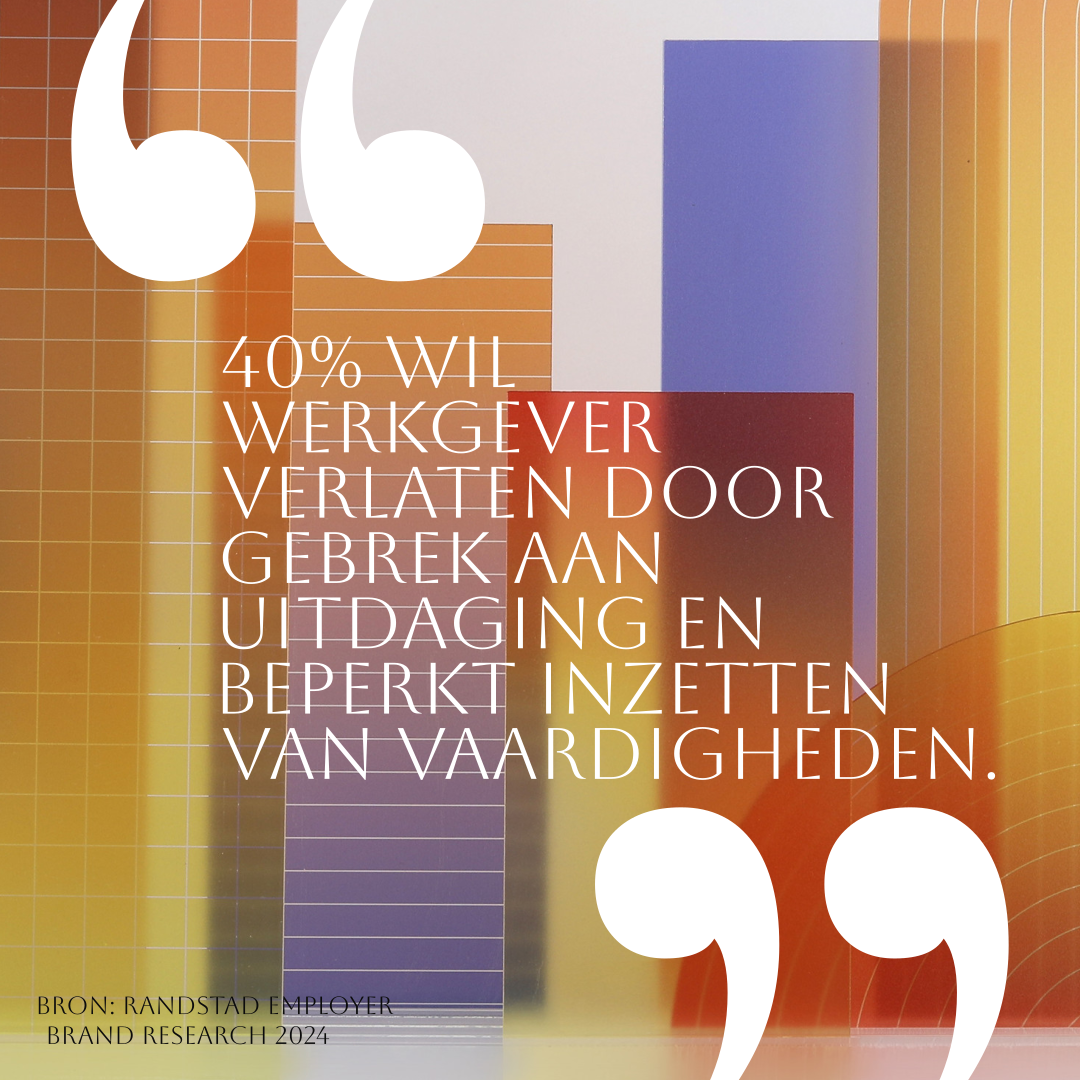 - hiervan geeft 40% van de medewerkers geeft aan zijn werkgever te verlaten vanwege gebruik aan uitdaging en niet kunnen inzetten van vaardigheden.